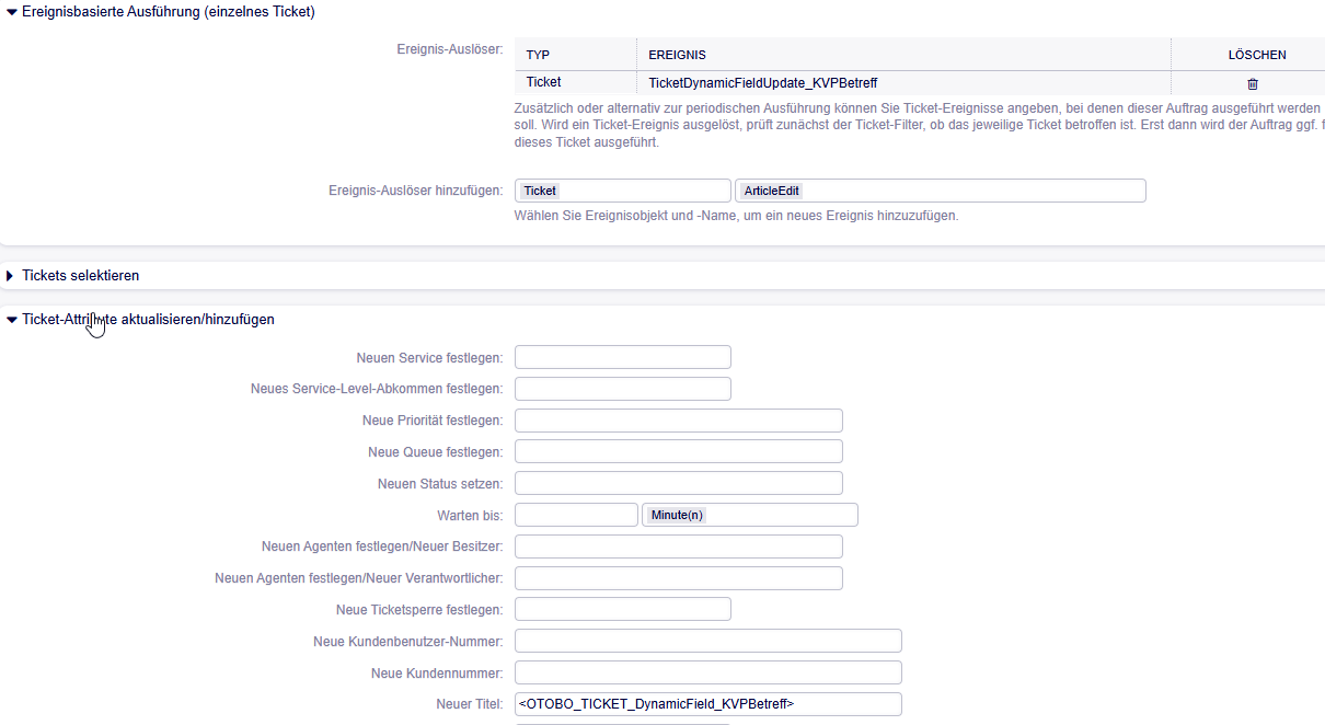 Ich habe dynamische Felder angelegt und diese auch erfolgreich eingebunden. Da ich die Anzeigereihenfolge der Standardforms (Subject, Body, Attachment) nicht steuern kann, habe ich diese entfernt und möchte nun dafür sorgen, dass der Eintrag ins dynamische Feld „KVPBetreff“ als Titel/Betreff angelegt wird.