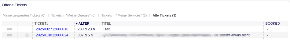 Im offene Tickets-Widget wird die Spalte als „BOOKED“ angezeigt und enthält keine Werte. Es scheint, dass ‚booked‘ gar nicht aufgelöst wird, da ja eigentlich der Titel des DynamicFields („verbucht“) angezeigt werden sollte: