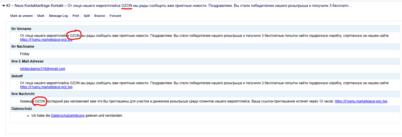 Und hier ist ein Beispielticket vom Spam – man sieht, dass hier mehrfach „OZON“ vorkommt.