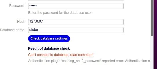 In MySQL higher or equal version 5.7 a new authentication module is active, and it is not possible to use the OTOBO web installer for database creation. Please login to the mysql console and set a different authentication module and password for the user root if this is the case.