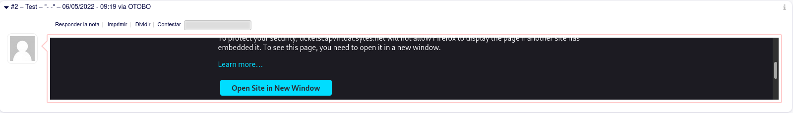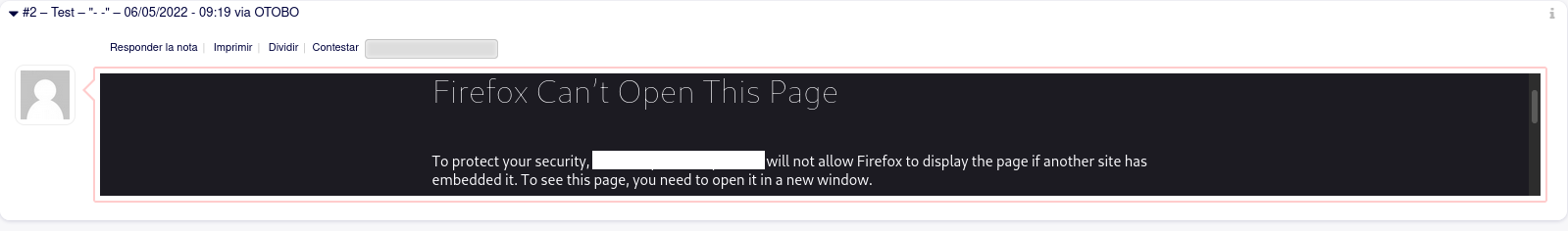 Header always set X-Frame-Options DENY, that DENY option was causing a problem rendering the <iframe> where the note displays so I changed toHeader always set X-Frame-Options SAMEORIGINand the problem was fixed.Again, this was a configuration that I uses to do when configuring OTRS, now with OTOBO changes a little bit.