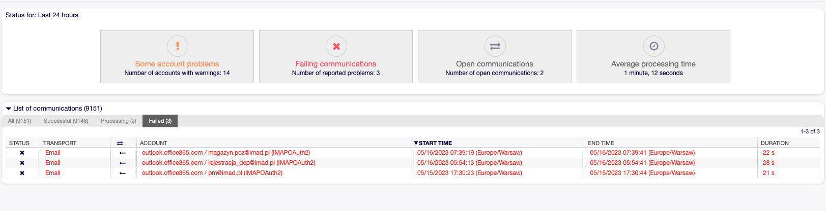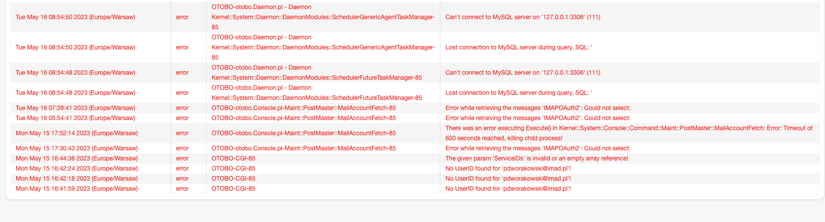 Our FQDN is exactly our domain that we use so i don’t know if changing <OTOBO_CONFIG_FQDN> would make a difference. I attach screenshots of System Log and Communication log below