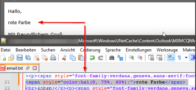 Heute ist aufgefallen, dass eine geänderte Schriftfarbe nicht von Outlook angezeigt werden kann, da diese aus dem CKEditor als HSL-Definition übertragen wird. Stattdessen wird sie immer schwarz angezeigt.