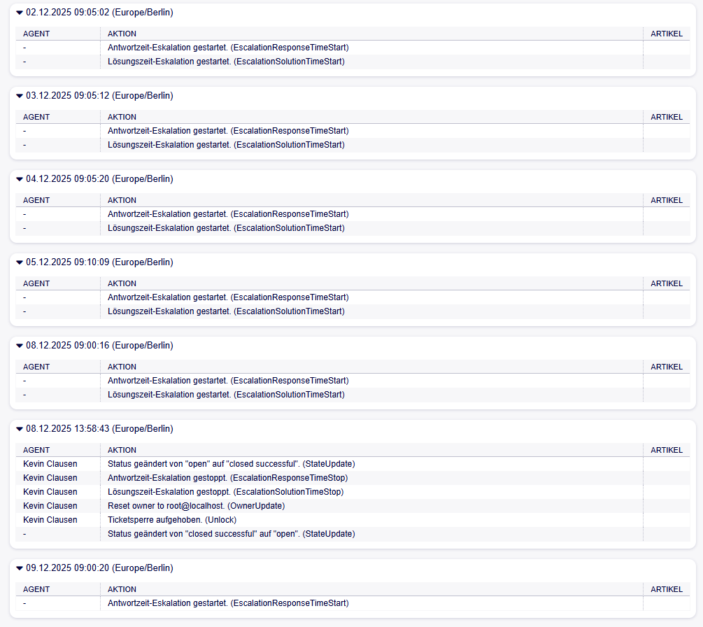 Ich nehme Bezug auf die Einträge am 8.12. hier wurde als letzte Aktion das Ticket wieder geöffnet. Die Aktion wurde von